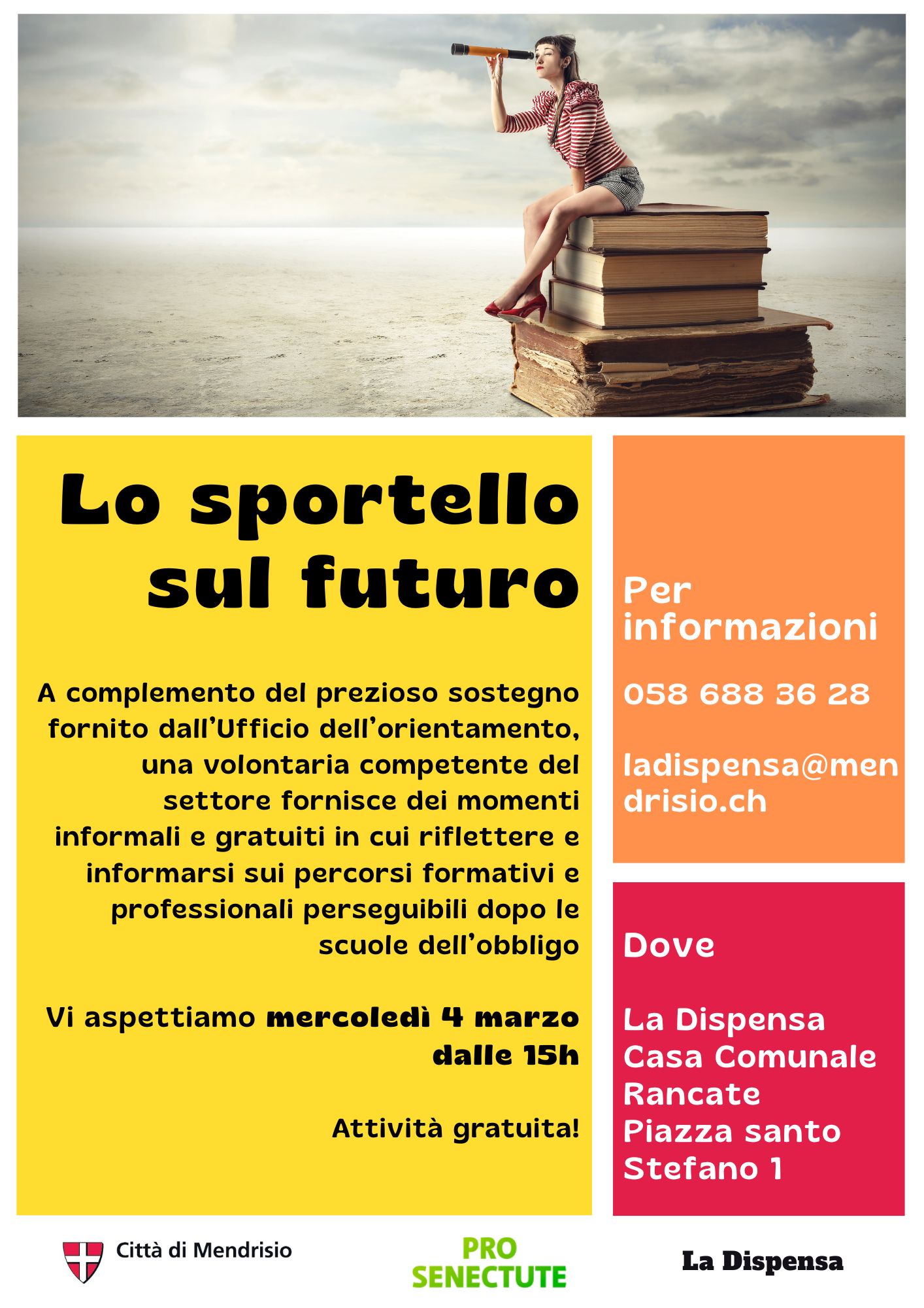 Prosegue, presso La Dispensa a Rancate, il ciclo di appuntamenti de “Lo sportello sul futuro”, uno spazio di incontro informale dedicato ai giovani – idealmente in età di scuola media – che desiderano riflettere sulle possibili strade da intraprendere dopo le scuole dell’obbligo.